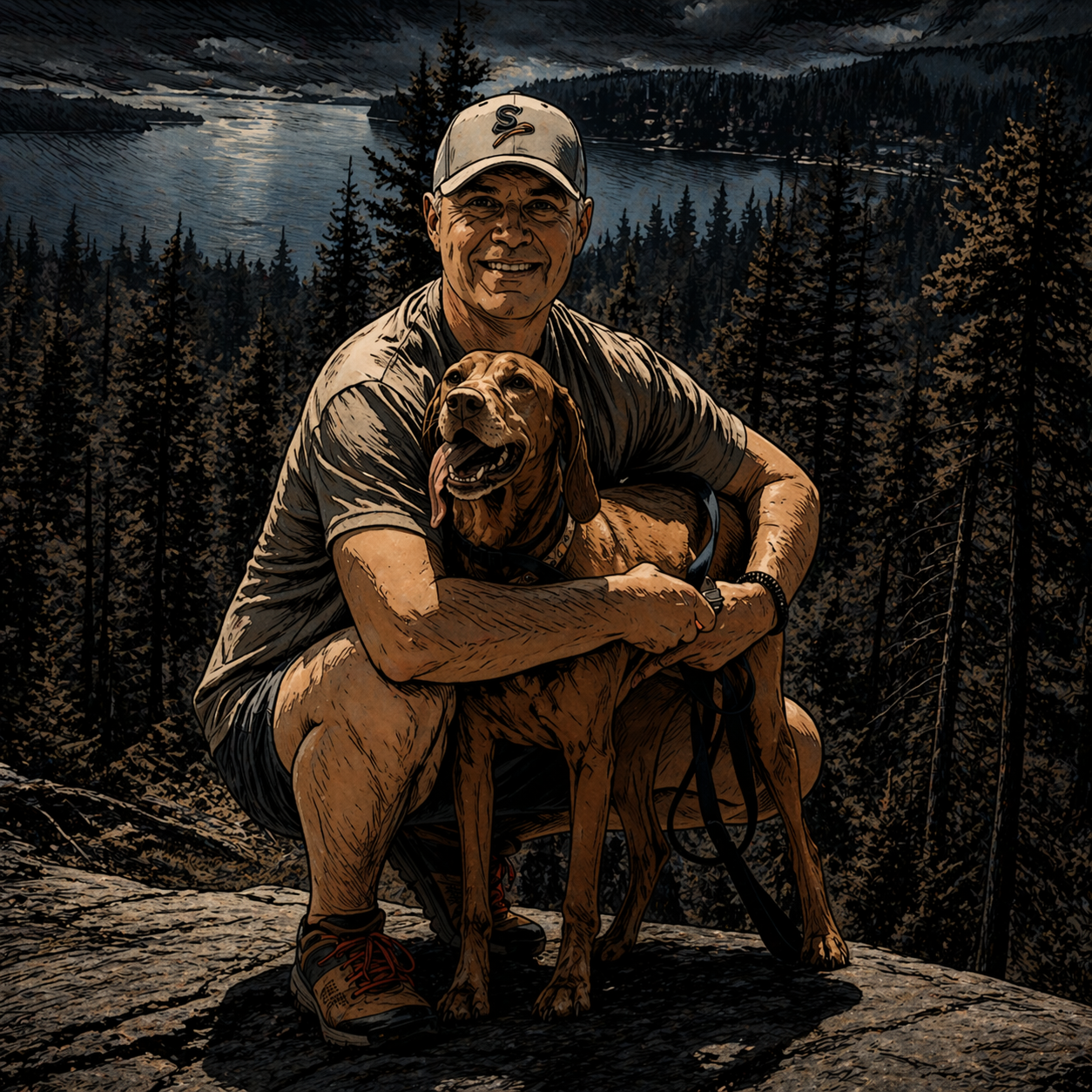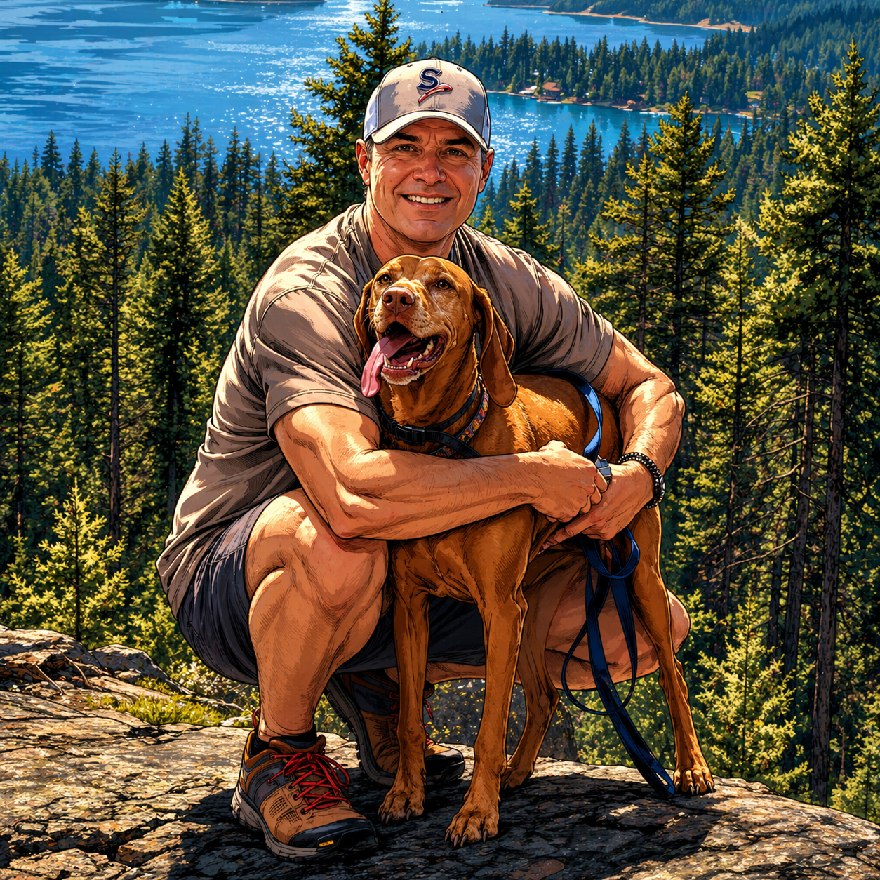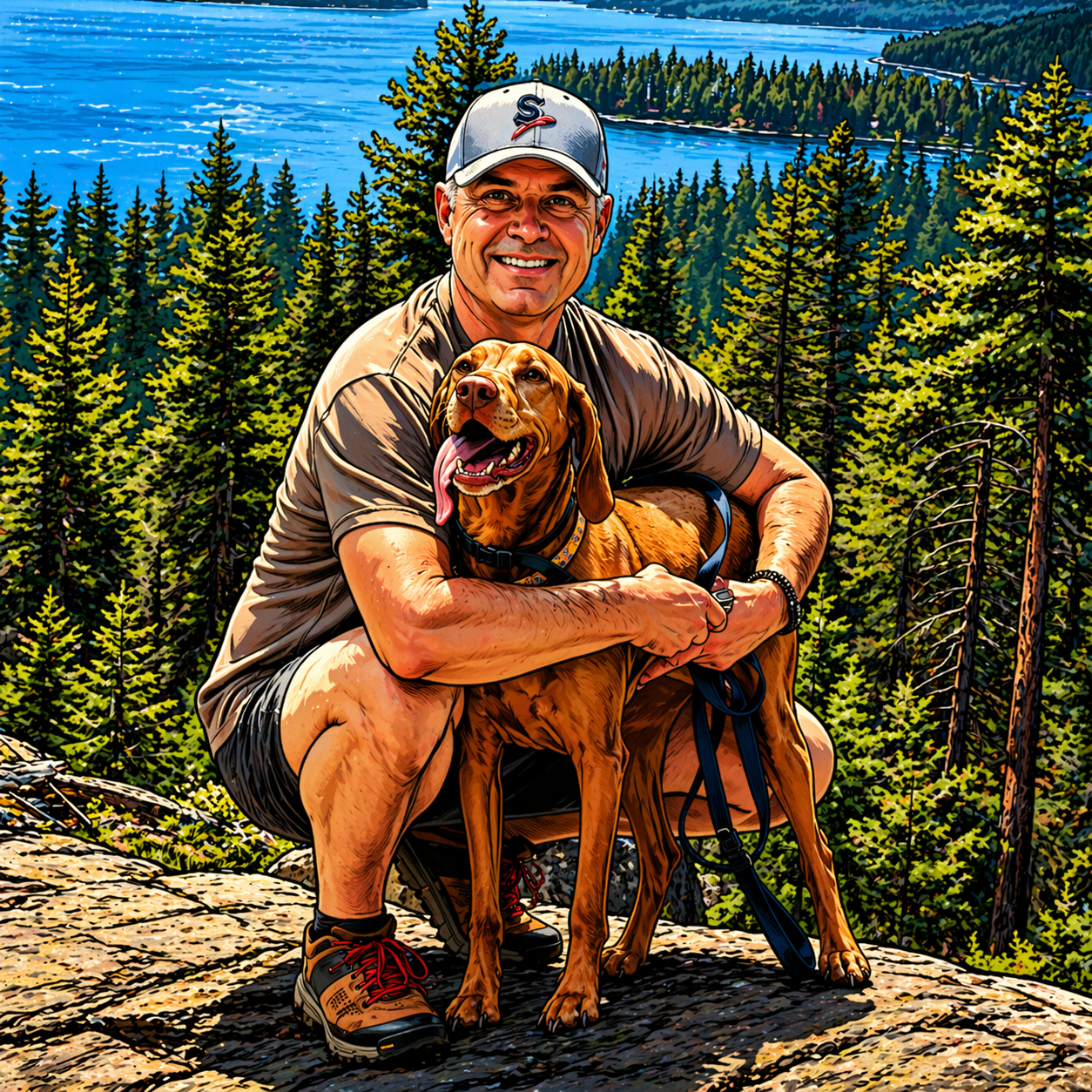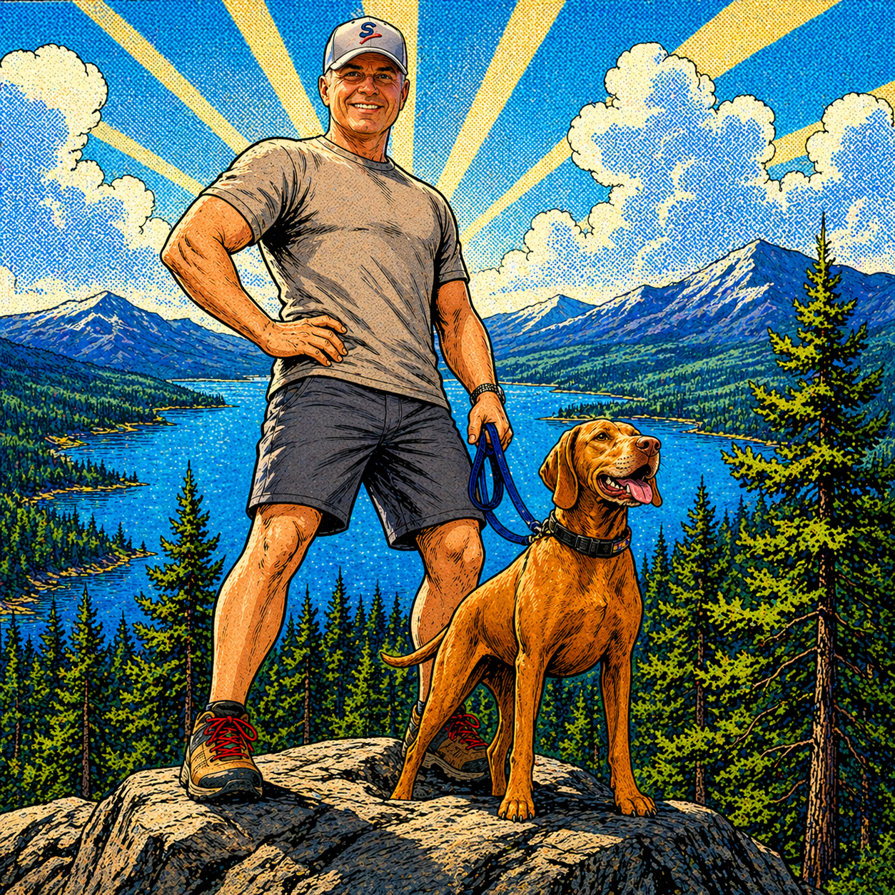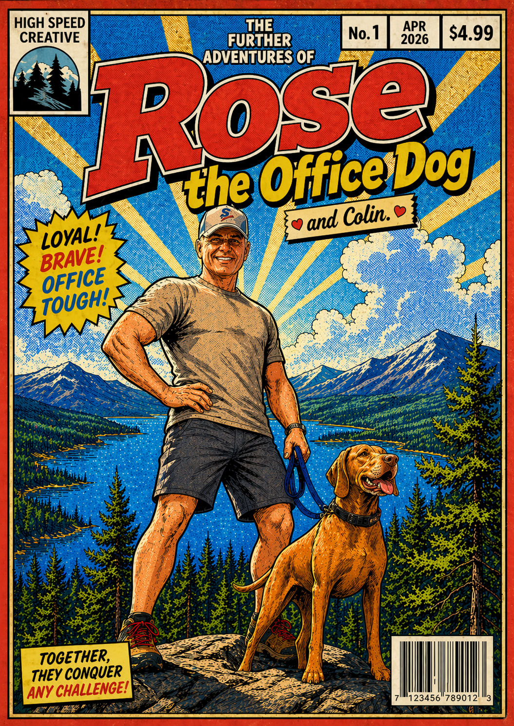 Prompt #6: can you take the silver age design and put the dog and me in more heroic stances. Still standing on a mountain top.